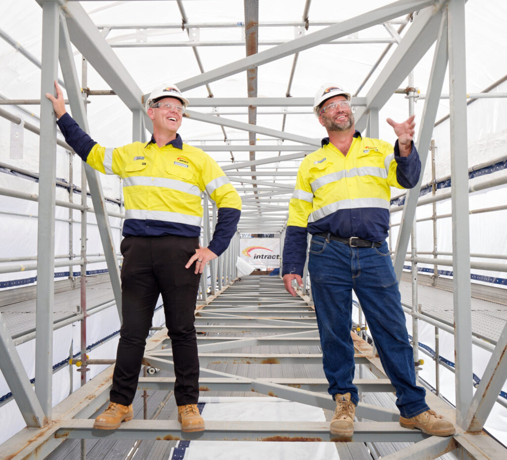 Image: Intract Australia Project Manager, Aaron Coleman, and Intract Australia Site Supervisor, Mick Dean, standing on the ‘skybridge’, one of the bridges currently being refurbished at ASC’s Henderson site.